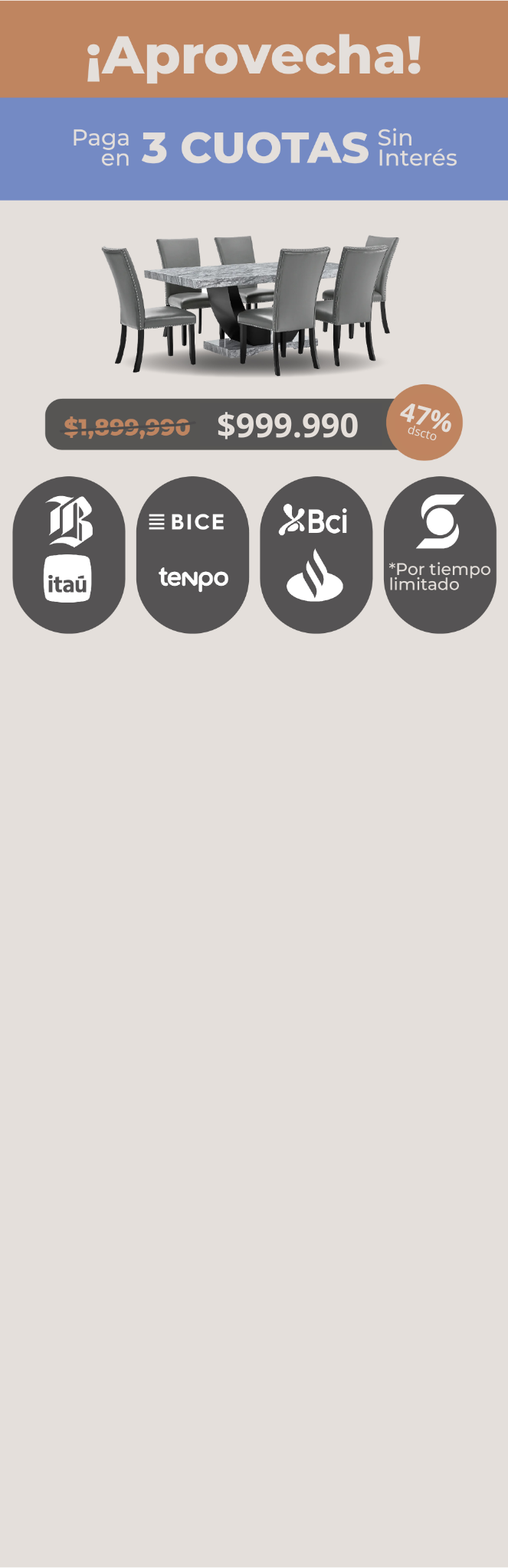 Crea un espacio que hable de tu estilo. Este conjunto de living y comedor destaca por su armonía visual, combinando una paleta de tonos grises neutros con superficies de mármol blanco y detalles en madera oscura.