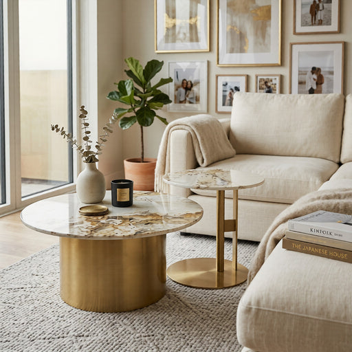 Mesa de Centro Redonda Elegante Dorada de Mármol Cantabria